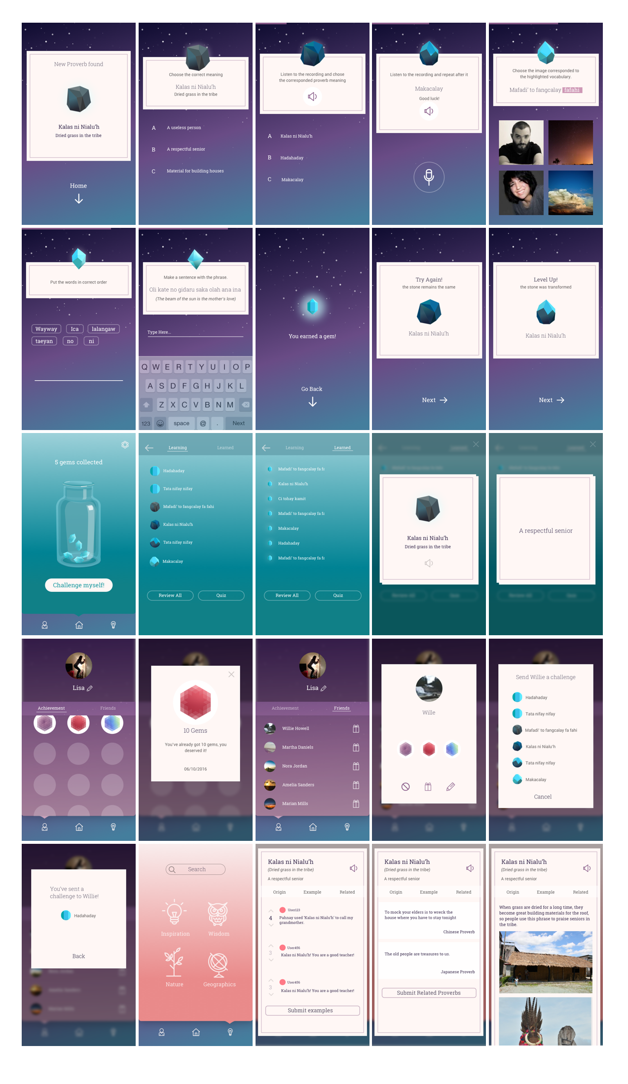 在此專案裡,視覺設計也是我負責。為了吸引使用者,唯美、浪漫、神秘的介面是此設計必要的一部份,因此花了許多時間在探索適合的顏色組合跟字型設計上。